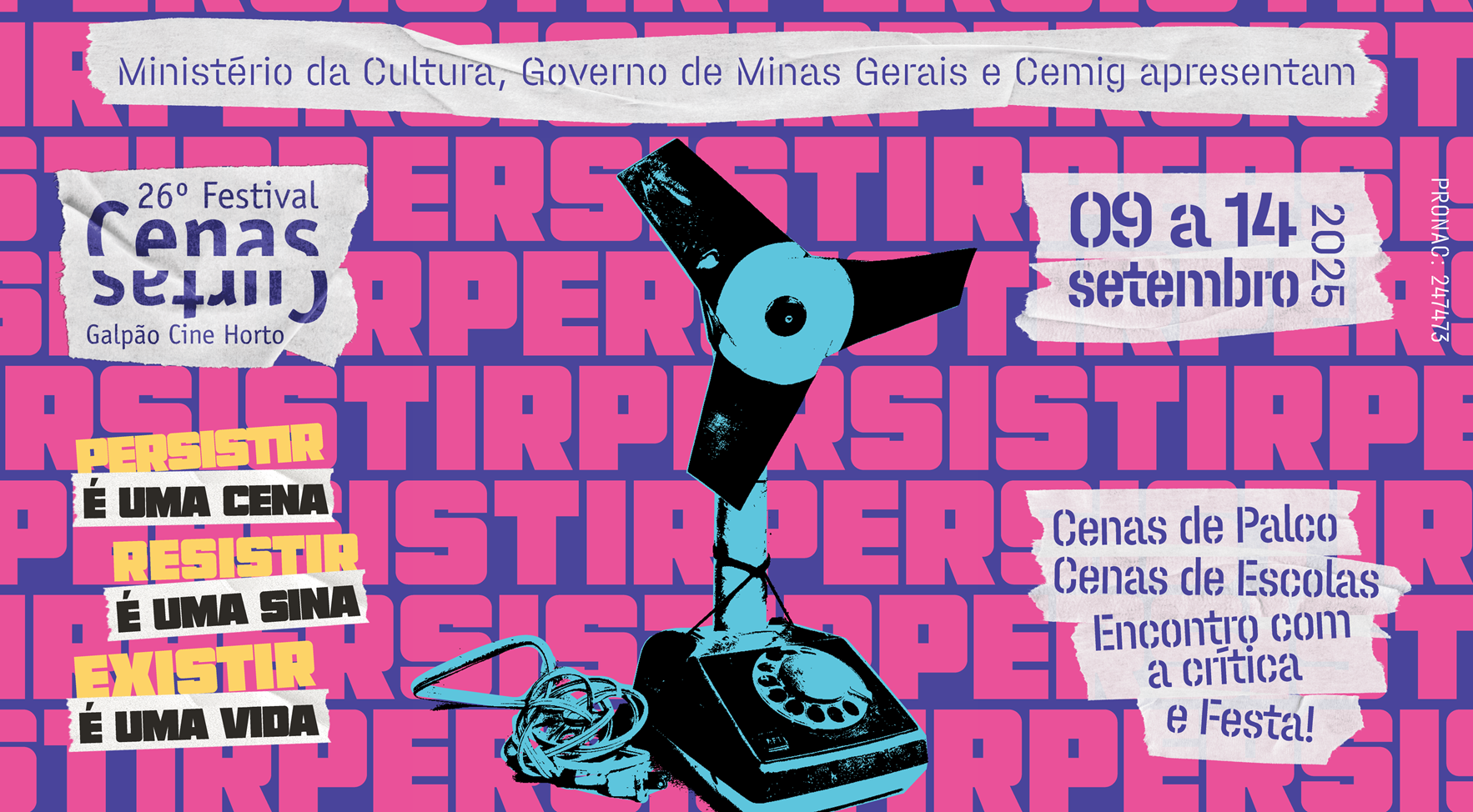 Um dos mais importantes festivais de teatro do país, o Festival Cenas Curtas 2025, realizado pelo Galpão Cine Horto, chega à sua 26ª edição entre os dias 9 e 14 de setembro, em Belo Horizonte, com apresentações no Teatro Wanda Fernandes. A programação reúne 16 cenas selecionadas pela curadoria, vindas de Minas Gerais, São Paulo, Rio de Janeiro, Espírito Santo, Paraná e Amazonas, além de rodas de conversa com a crítica, cenas de escolas de teatro de BH, intervenções e a já tradicional festa de anúncio das cenas mais votadas.Com a temática “Persistir é uma cena. Existir é uma peça. Resistir é uma sina”, o Cenas Curtas 2025 evoca uma dramaturgia da sobrevivência. A arte visual da edição mistura colagens e objetos retrôs – como um telefone antigo transformado em ventilador – para evocar memória, ruído, corpo e gesto em constante rotação. A curadoria aposta em criações que carregam em si a urgência de estar em cena num mundo em crise. Mais do que nunca, o festival se posiciona como um espaço de encontro de corpos que insistem, tensionam e reinauguram formas de viver e de criar. A proposta valoriza trabalhos que investigam performatividades híbridas, dramaturgias do cotidiano, ancestralidades e dissidências.