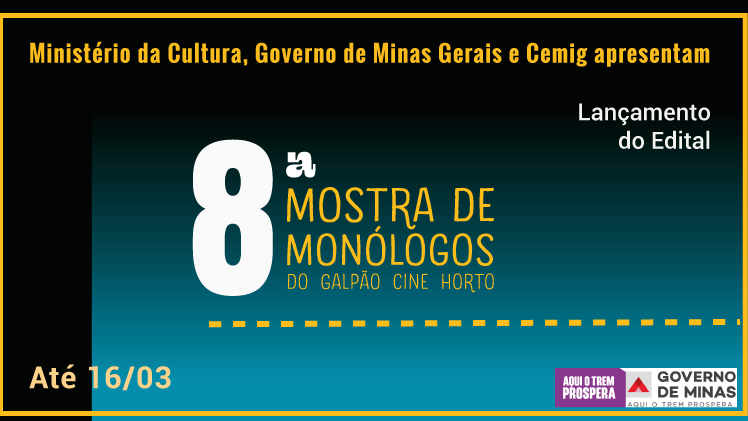 Está aberto o Edital de Seleção para a 8ª edição da Mostra de Monólogos do Galpão Cine Horto, que acontecerá entre os dias 23 e 26 de Junho de 2026 no Teatro Wanda Fernandes. Dando continuidade à tradição deste projeto, desejamos incentivar a produção de trabalhos solo e promover a troca colaborativa de estudantes de escolas de teatro de Belo Horizonte e Região Metropolitana.