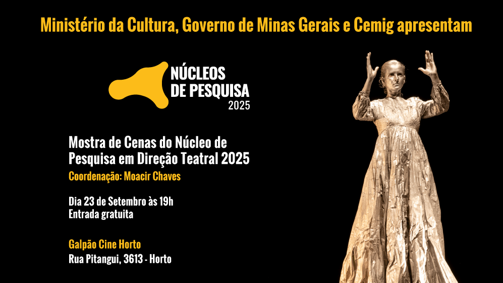 A Mostra de Cenas do Núcleo de Pesquisa em Direção Teatral 2025 reúne experimentações teatrais inovadoras, com o objetivo de refletir e questionar as múltiplas possibilidades da arte cênica contemporânea. Sob a coordenação de Moacir Chaves, o evento apresenta um recorte das produções mais recentes, resultado do trabalho intenso e colaborativo dos artistas envolvidos no Núcleo de Pesquisa.